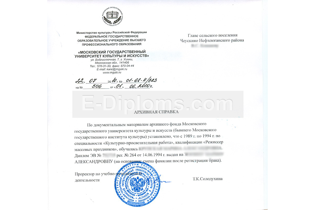 Вы можете купить архивную справку, подтверждающую факт Вашего обучения в вузе или колледже / техникуме, а также факт выдачи диплома об образовании. Справка обязательно содержит информацию о том, в какой период и по какой специальности обучался студент, а также серию и номер полученного документа. Заполняем по образцу выбранного учебного заведения. Доставка бесплатна, оплата при получении, для проживающих в регионах доступна услуга «макет», есть скидки. При заказе до 14.00 привезем уже завтра!